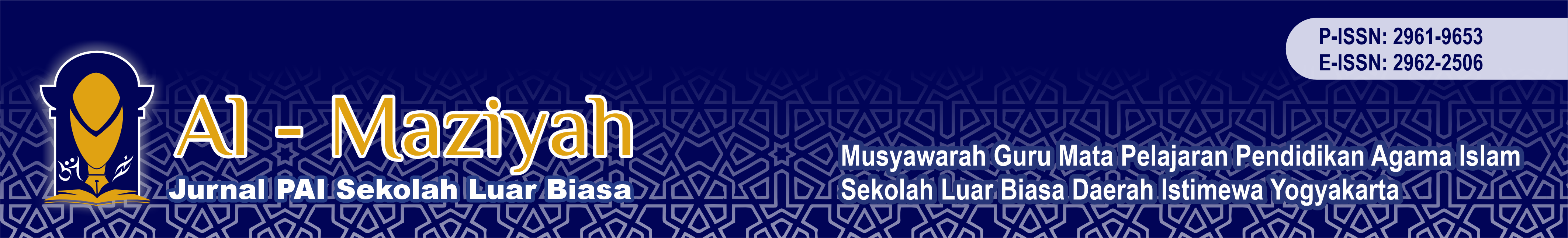 Al-Maziyah Mempublikasikan artikel ilmiah yang terkait dengan Pendidikan Agama Islam yang bertujuan untuk meningkatkan kualitas pendidikan dan pengajaran Pendidikan Agama Islam di sekolah luar biasa menerbitkan penelitian baik berupa pemikiran, Penilaian Tindakan Kelas (PTK). Kebijakan, dan isu-isu kontemporer yang berkaitan dengan pengembangan teori dan praktik dalam Pendidikan Agama Islam di sekolah luar biasa.